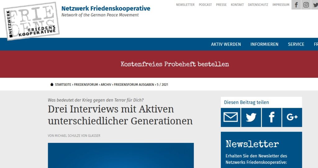 Im aktuellen Friedensforum (5/2021) findet sich ein sehr lesenswertes Interview. Thema: Der Krieg gegen den Terror. Friedensaktivist*innen dreier Generationen werden befragt, wie sie die Bedeutung des 11.9.2001, die anschließenden Kriege in Afghanistan und im Irak und die Proteste dagegen heute sehen.