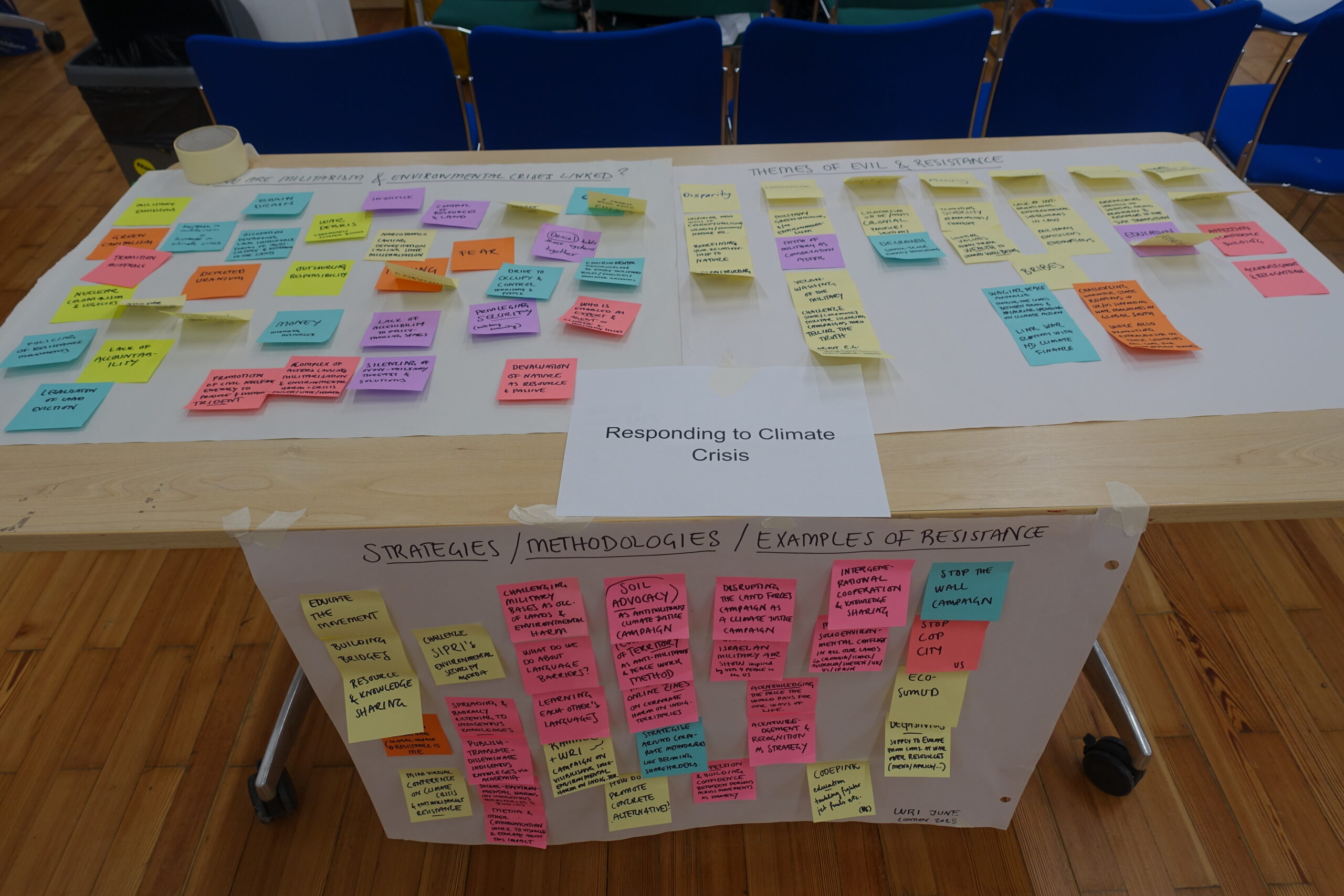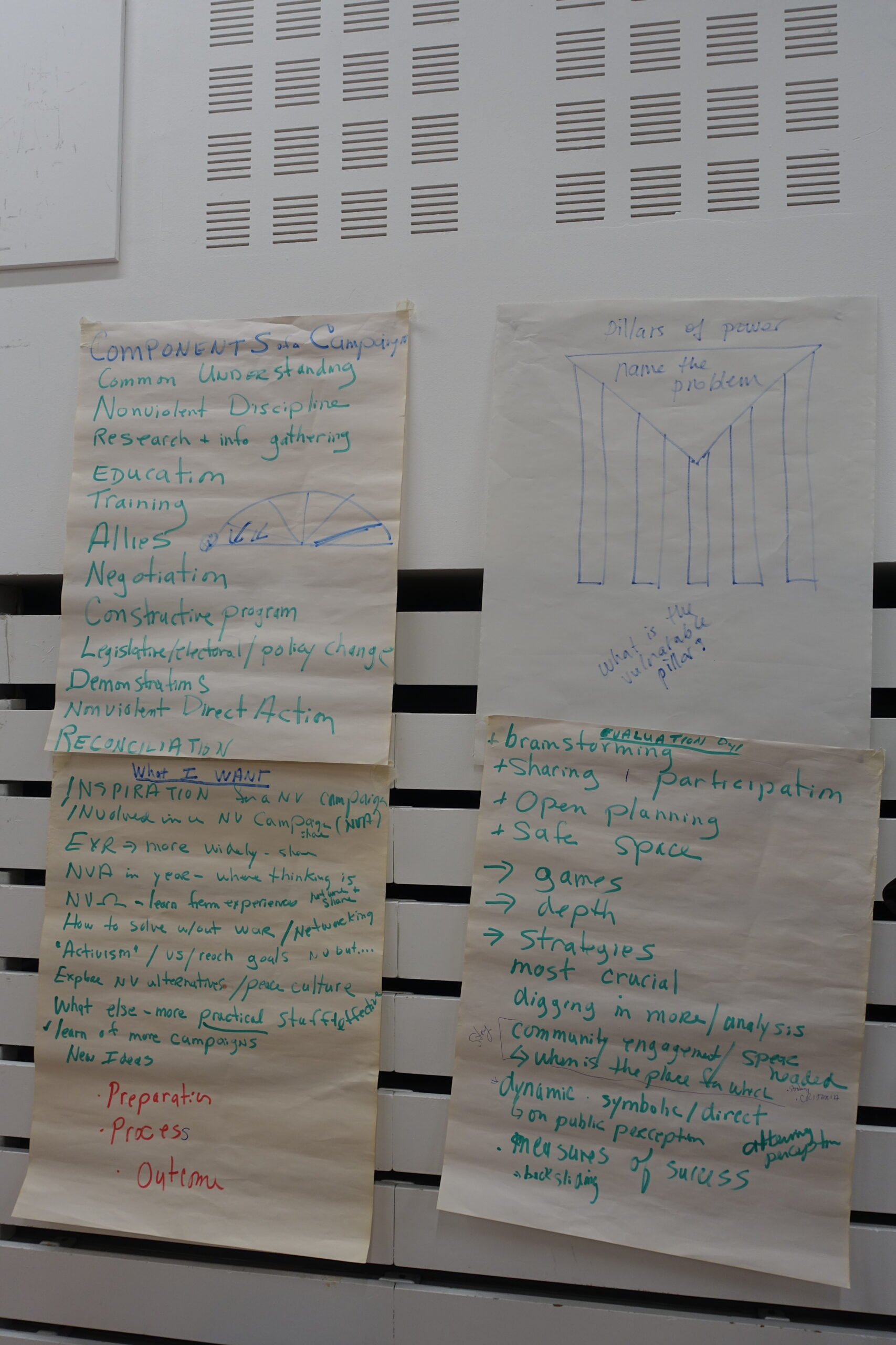 In der Nonviolent Campaign Themengruppe geht es heute darum, neben dem Hauptziel einer Kampagne auch sinnvolle, in kurzer Zeit erreichbare Zwischenziele zu finden. Außerdem machen wir heute eine Aufstellung dazu, ob ein Mittel gewaltfrei/nicht gewaltfrei und effektiv/ nicht effektiv ist. Dabei lerne ich, dass in Spanien Polizist*nnen ihre Uniform selber waschen müssen, weshalb Menschen auf die Idee kommen Farbbeutel zum Polist*nnen abschrecken zu benutzen, weil die kein Bock haben, das hinterher sauber machen zu müssen. Anscheinend reicht auch schon die „Androhung“ einen zu werfen, damit mensch in Ruhe gelassen wird.