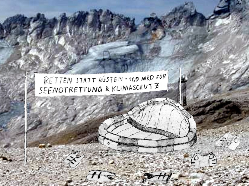 Wir besteigen die Zugspitze und markieren den Fortschritt des Klimawandels auf den dortigen Gletschern mit einem Protest-Banner. Auf dem Banner steht „Klima retten statt Aufrüstung!“ Denn die unnötige militärische Aufrüstung verschlingt Mittel, die wir dringend für eine Klimaschutzpolitik brauchen. Wir glauben, das mit einem ausdruckstarken Bild einer Aktion auf dem Gletscher der Öffentlichkeit deutlich machen zu können.